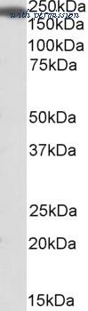Western Blot staining of Human Kidney lysate using PA5-19189 at a concentration of 1.0 ug/ml, the primary antibody incubation was 1 hour and the detection method was chemiluminescence.