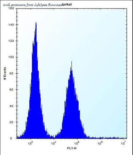ABI2 Antibody flow cytometry of Jurkat cells (right histogram) compared to a negative control cell (left histogram). FITC-conjugated donkey-anti-rabbit secondary antibodies were used for the analysis.