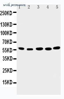 WB of ABI2B / ABI2 antibody. Lane 1: Rat Brain Tissue Lysate. Lane 2: Human Placenta Tissue Lysate. Lane 3: MCF-7 Cell Lysate. Lane 4: HELA Cell Lysate. Lane 5: JURKAT Cell Lysate.