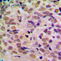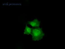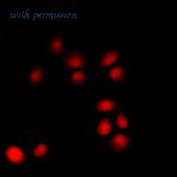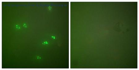 Immunofluorescence analysis of HeLa cells, using p14 ARF Antibody. The picture on the right is blocked with the synthesized peptide.