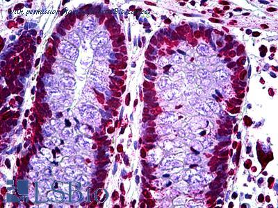 IHC of paraffin-embedded Adenocarcinoma of Human colon tissue using anti-CDKN2A mouse monoclonal antibody. (Heat-induced epitope retrieval by 1 mM EDTA in 10mM Tris, pH8.5, 120°C for 3min).