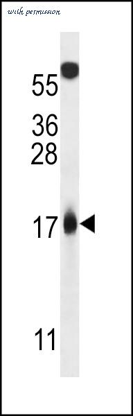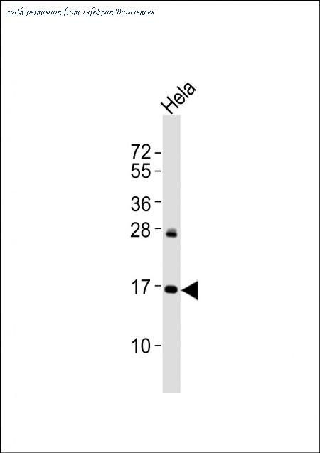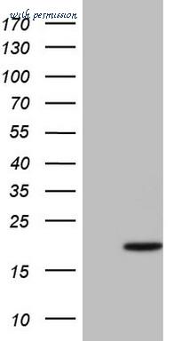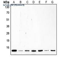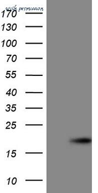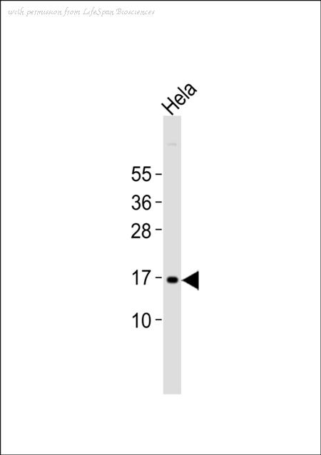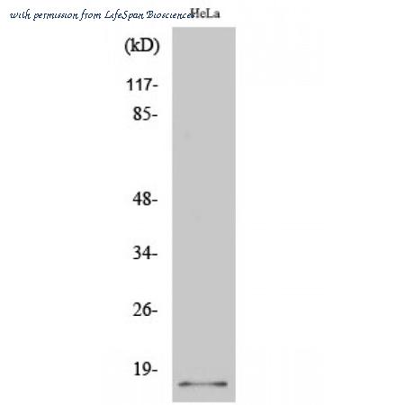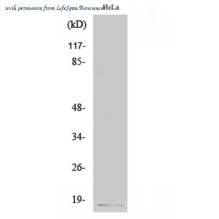 Anti-p14 ARF Antibody at 1:1000 dilution + HeLa whole cell lysates Lysates/proteins at 20 ug per lane. Secondary Goat Anti-Rabbit IgG, (H+L),Peroxidase conjugated at 1/10000 dilution Predicted band size : 14 kDa Blocking/Dilution buffer: 5% NFDM/TBST.