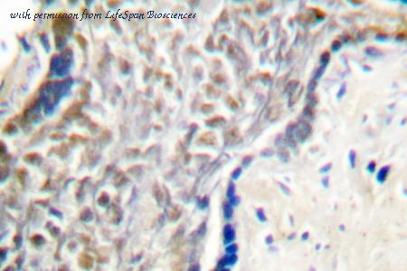 Immunohistochemical analysis of p14 ARF staining in human breast cancer formalin fixed paraffin embedded tissue section. The section was pre-treated using heat mediated antigen retrieval with sodium citrate buffer (pH 6.0). The section was then incubated with the antibody at room temperature and detected using an HRP conjugated compact polymer system. DAB was used as the chromogen. The section was then counterstained with hematoxylin and mounted with DPX.