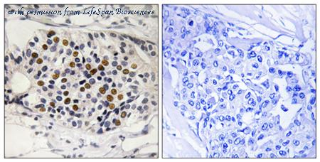 Immunohistochemistry analysis of paraffin-embedded human placenta tissue, using p14 ARF Antibody. The picture on the right is blocked with the synthesized peptide.