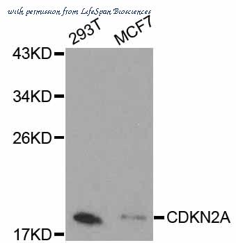 Western blot analysis of extracts of various cell lines, using CDKN2A antibody. The secondary antibody used was an HRP Goat Anti-Rabbit IgG (H+L) at 1:10000 dilution. Lysates were loaded 25ug per lane and 3% nonfat dry milk in TBST was used for blocking.