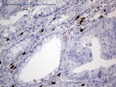 Anti-p16INK4A antibody IHC of human colon, crypt. Immunohistochemistry of formalin-fixed, paraffin-embedded tissue after heat-induced antigen retrieval. Antibody concentration 5 ug/ml.