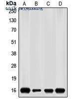 Western blot analysis of p16 INK4a expression in HEK293T (A); HeLa (B); mouse brain (C); rat brain (D) whole cell lysates.