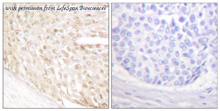 Immunohistochemistry analysis of paraffin-embedded human breast carcinoma tissue, using p18 INK Antibody. The picture on the right is blocked with the synthesized peptide.