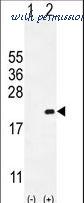 Western blot of CDKN2C (arrow) using rabbit polyclonal CDKN2C Antibody. 293 cell lysates (2 ug/lane) either nontransfected (Lane 1) or transiently transfected (Lane 2) with the CDKN2C gene.