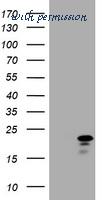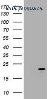 HEK293T cells were transfected with the pCMV6-ENTRY control (Left lane) or pCMV6-ENTRY CDKN2C (Right lane) cDNA for 48 hrs and lysed. Equivalent amounts of cell lysates (5 ug per lane) were separated by SDS-PAGE and immunoblotted with anti-CDKN2C.