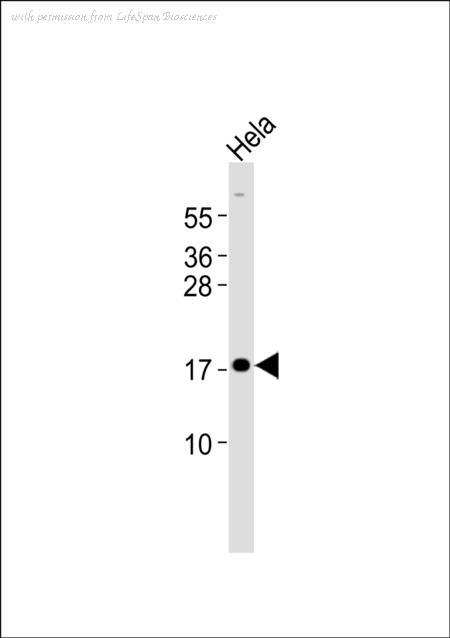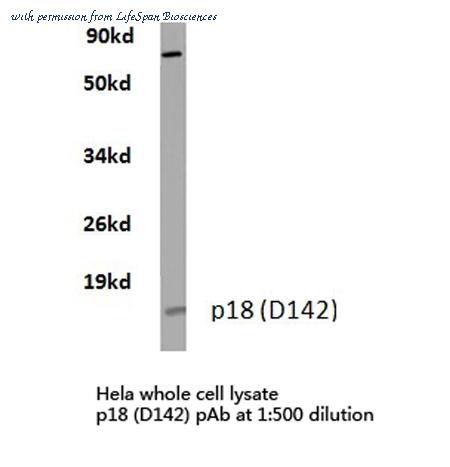 Western blot of p18 INK (D142) pAb in extracts from HeLa cells.