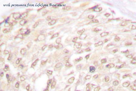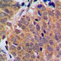 IHC of p18 INK (D142) pAb in paraffin-embedded human breast carcinoma tissue.