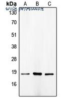 Western blot analysis of p18 INK4c expression in HeLa (A); NIH3T3 (B); COLO205 (C) whole cell lysates.