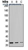 Western blot analysis of LYPLA1 expression in MDAMB453 (A); mouse kidney (B); rat kidney (C) whole cell lysates.