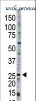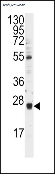 Western blot of anti-UBCH9 Antibody in Y79 cell line lysates (35 ug/lane). UBCH9 (arrow) was detected using the purified antibody.