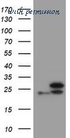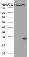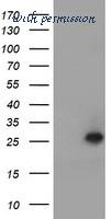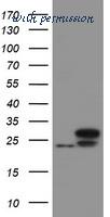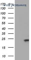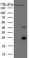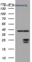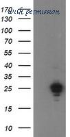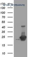 HEK293T cells were transfected with the pCMV6-ENTRY control (Left lane) or pCMV6-ENTRY UBE2E3 (Right lane) cDNA for 48 hrs and lysed. Equivalent amounts of cell lysates (5 ug per lane) were separated by SDS-PAGE and immunoblotted with anti-UBE2E3.