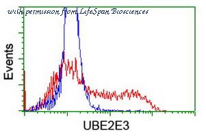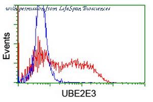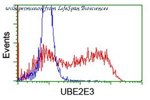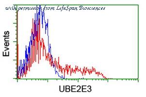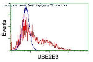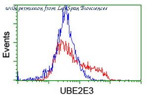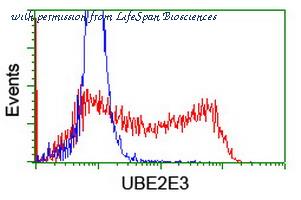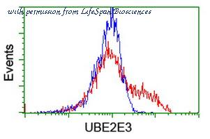HEK293T cells transfected with either overexpress plasmid (Red) or empty vector control plasmid (Blue) were immunostained by anti-UBE2E3 antibody, and then analyzed by flow cytometry.