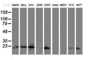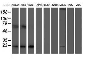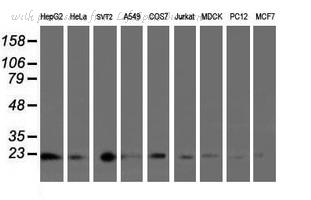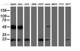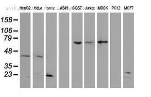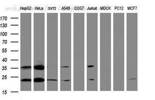 Western blot of extracts (35ug) from 9 different cell lines by using anti-UBE2E3 monoclonal antibody (HepG2: human; HeLa: human; SVT2: mouse; A549: human; COS7: monkey; Jurkat: human; MDCK: canine; PC12: rat; MCF7: human).
