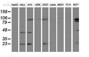 Western blot of extracts (35 ug) from 9 different cell lines by using anti-UBE2E3 monoclonal antibody (HepG2: human; HeLa: human; SVT2: mouse; A549: human; COS7: monkey; Jurkat: human; MDCK: canine; PC12: rat; MCF7: human).