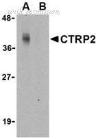 Western blot of CTRP2 in Caco-2 cell lysate with CTRP2 antibody at 1 ug/ml in either the (A) absence or (B) presence of blocking peptide.