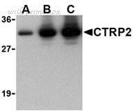 Western blot of CTRP2 in 3T3 (Balb) cell lysate with CTRP2 (IN) antibody at (A) 1, (B) 2, and (C) 4 ug/ml.