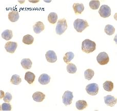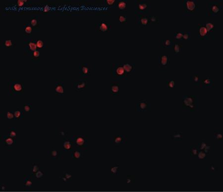 Immunocytochemistry of CTRP2 in Jurkat cells with CTRP2 antibody at 10 µg/ml.