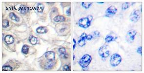 IHC of paraffin-embedded human breast carcinoma tissue, using BAD (Cleaved-Asp71) Antibody. The picture on the right is treated with the synthesized peptide.