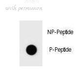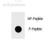 Dot blot of Phospho-mouse BAD-S134 Antibody Phospho-specific antibody on nitrocellulose membrane. 50ng of Phospho-peptide or Non Phospho-peptide per dot were adsorbed. Antibody working concentrations are 0.6ug per ml.