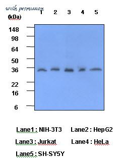 Cell lysates of NIH-3T3, HepG2, Jurkat, HeLa and SH-SY5Y (each 40 ug) were resolved by SDS-PAGE, transferred to PVDF membrane and probed with anti-human CRP (1:1000). Proteins were visualized using a goat anti-mouse secondary antibody conjugated to HRP and an ECL detection system. Lane 1: NIH-3T3; Lane 2: HepG2; Lane 3: Jurkat; Lane 4: HeLa; Lane 5: SH-SY5Y.