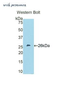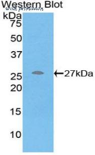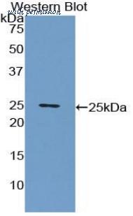 Western Blot; Sample: Porcine Liver lysate; Primary Ab: 1µg/ml Rabbit Anti-Porcine CRP Antibody Second Ab: 0.2µg/mL HRP-Linked Caprine Anti-Rabbit IgG Polyclonal Antibody
