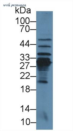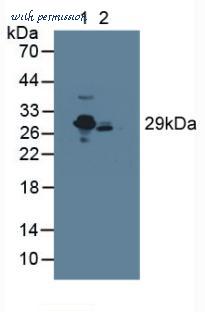 Western Blot; Sample: Rat Serum; Primary Ab: 2µg/mL Rabbit Anti-Cavia CRP Antibody Second Ab: 0.2µg/mL HRP-Linked Caprine Anti-Rabbit IgG Polyclonal Antibody