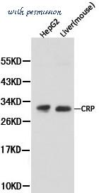 Western blot of CRP pAb in extracts from HepG2 cells and mouse liver tissue.