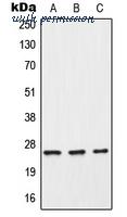 Western blot analysis of C-Reactive Protein expression in HeLa (A); mouse liver (B); H9C2 (C) whole cell lysates.