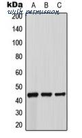 Western blot analysis of Beta-3 Adrenergic Receptor expression in MCF7 (A); mouse kidney (B); rat liver (C) whole cell lysates.