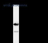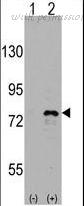 Western blot of DDX3 (arrow) using rabbit polyclonal DDX3 Antibody. 293 cell lysates (2 ug/lane) either nontransfected (Lane 1) or transiently transfected with the DDX3 gene (Lane 2) (Origene Technologies).