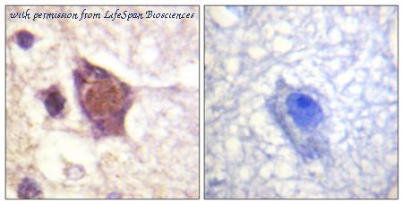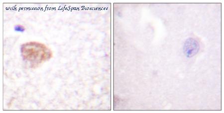 Immunohistochemistry analysis of paraffin-embedded human brain, using DDX3/DEAD-box Protein 3 (Phospho-Thr322) Antibody. The picture on the right is blocked with the phospho peptide.