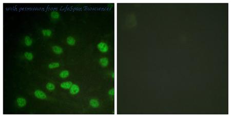 Immunofluorescence analysis of HUVEC cells treated with serum 20% 30', using DDX3/DEAD-box Protein 3 (Phospho-Thr322) Antibody. The picture on the right is blocked with the phospho peptide.