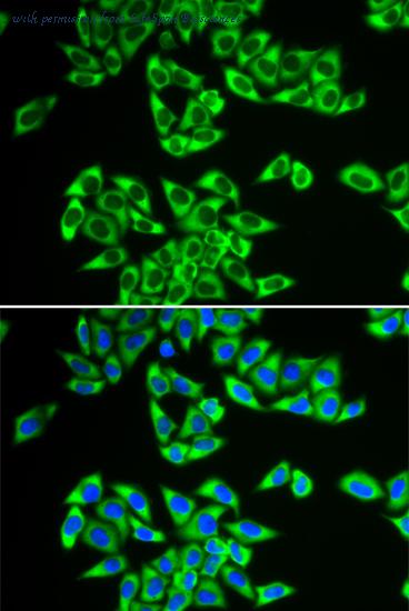 Immunocytochemistry of DDX3 in HepG2 cells with DDX3 antibody at 10 ug/ml.