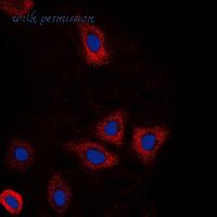 Immunofluorescent analysis of DDX3X staining in HepG2 cells. Formalin-fixed cells were permeabilized with 0.1% Triton X-100 in TBS for 5-10 minutes and blocked with 3% BSA-PBS for 30 minutes at room temperature. Cells were probed with the primary antibody in 3% BSA-PBS and incubated overnight at 4 ??C in a humidified chamber. Cells were washed with PBST and incubated with a DyLight 594-conjugated secondary antibody (red) in PBS at room temperature in the dark. DAPI was used to stain the cell nuclei (blue).