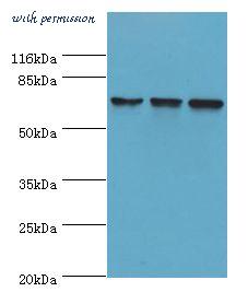 Western blot. All lanes: DDX3X antibody at 12 ug/ml. Lane 1: NIH3T3 whole cell lysate Lane 2: K562 whole cell lysate Lane 3: Jurkat whole cell lysate. Secondary antibody: goat polyclonal to rabbit at 1:10000 dilution. Predicted band size: 73 kDa. Observed band size: 73 kDa. This image was taken for the unconjugated form of this product. Other forms have not been tested.