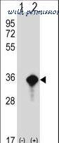 Western blot of AES (arrow) using rabbit polyclonal AES Antibody. 293 cell lysates (2 ug/lane) either nontransfected (Lane 1) or transiently transfected (Lane 2) with the AES gene.