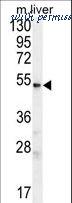 UGT3A2 Antibody western blot of mouse liver tissue lysates (35 ug/lane). The UGT3A2 antibody detected the UGT3A2 protein (arrow).