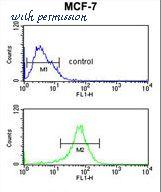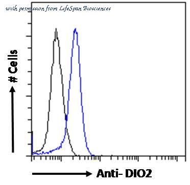DIO2 Antibody flow cytometry of MCF-7 cells (bottom histogram) compared to a negative control cell (top histogram). FITC-conjugated goat-anti-rabbit secondary antibodies were used for the analysis.
