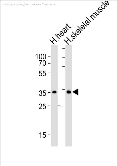 Western blot of lysates from human heart and human skeletal muscle tissue lysate (from left to right), using DIO2 Antibody. Antibody was diluted at 1:1000 at each lane. A goat anti-rabbit IgG H&L (HRP) at 1:10000 dilution was used as the secondary antibody. Lysates at 35ug per lane.