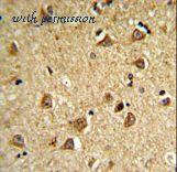DIO2 Antibody IHC of formalin-fixed and paraffin-embedded mouse brain followed by peroxidase-conjugated secondary antibody and DAB staining. This data demonstrates the use of the mouse DIO2 Antibody for immunohistochemistry.