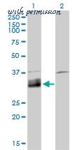 Western Blot analysis of DNASE1L1 expression in transfected 293T cell line by DNASE1L1 monoclonal antibody (M02), clone 4E8.Lane 1: DNASE1L1 transfected lysate(33.9 KDa).Lane 2: Non-transfected lysate.