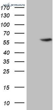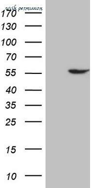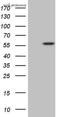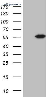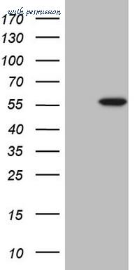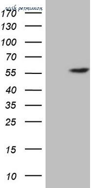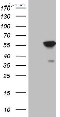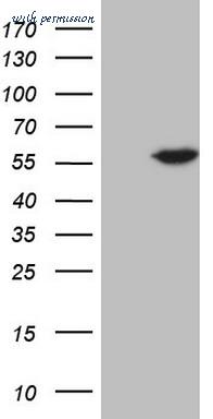 HEK293T cells were transfected with the pCMV6-ENTRY control (Left lane) or pCMV6-ENTRY ABAT (Right lane) cDNA for 48 hrs and lysed. Equivalent amounts of cell lysates (5 ug per lane) were separated by SDS-PAGE and immunoblotted with anti-ABAT.