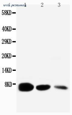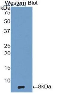 WB of EGF antibody. All lanes: Anti-EGF at 0.5ug/ml. Lane 1: Recombinant Mouse EGF Protein 10ng. Lane 2: Recombinant Mouse EGF Protein 5ng. Lane 3: Recombinant Mouse EGF Protein 2.5ng. Predicted bind size: 6KD. Observed bind size: 6KD.