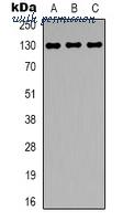 Western blot analysis of EGF expression in MCF7 (A); human platelet (B); NIH3T3 (C) whole cell lysates.