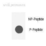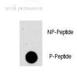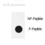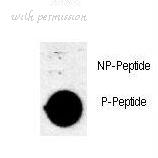 Dot blot of anti-AKT1-pS473 Phospho-specific antibody on nitrocellulose membrane. 50ng of Phospho-peptide or Non Phospho-peptide per dot were adsorbed. Antibody working concentrations are 0.5ug per ml.